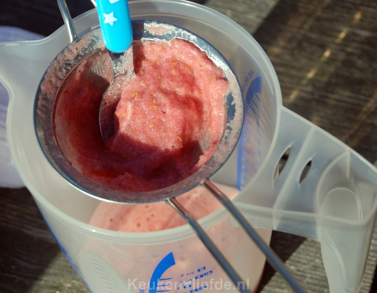 Ik zeefde de puree eerst nog even en dat zou ik echt iedereen willen aanraden. Niets is tijdens een flirt namelijk zo erg als frambozenpitjes tussen je tanden! 🙂 Vul de glazen af met de mousserende wijn.