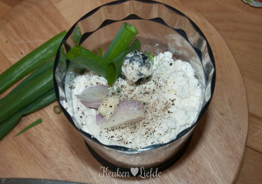 Doe de Hüttenkäse, lente-ui, peterselie, sjalot en knoflook in de staafmixer en mix tot een gladde spread. Breng op smaak met zout en peper uit de molen. Mocht je de spread direct willen gebruiken en hem nog iets te dik vinden, kun je hem eventueel verdunnen met bijvoorbeeld yoghurt of citroensap. Wanneer je de spread wegzet in de koelkast voor later gebruik, zal dit niet nodig zijn omdat hij na verloop van tijd vanzelf wat dunner wordt.
