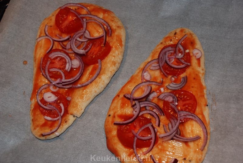Verwarm de oven voor op 225 graden. Bekleed een bakblik met een vel bakpapier en leg hierop de naanbroden. Bestrijk het naanbrood met de ketchup en beleg met alle overige ingrediënten.
