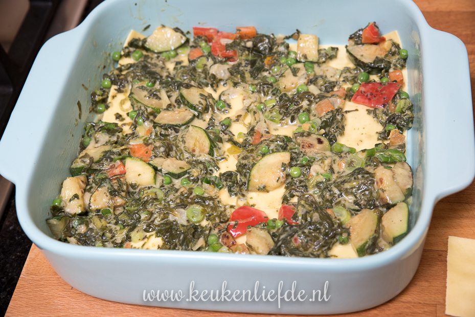 Ik voegde nog extra groenten (1/2 courgette, 1/4 winterpeen, en 1/2 rode paprika in blokjes gesneden) uit de koelkast toe die ik even aanbakte in de koekenpan en daarna door de spinazie mengde.