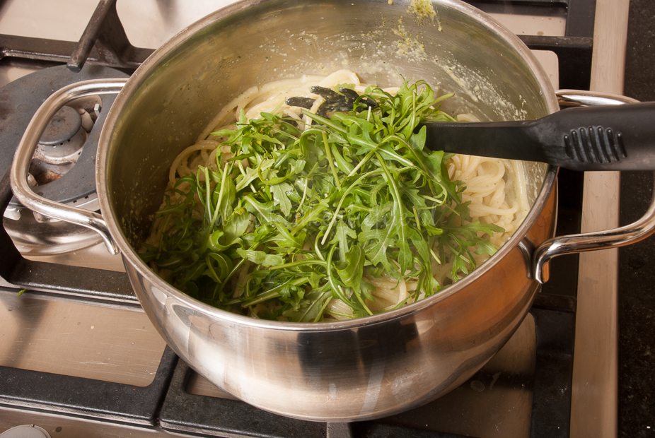 Giet de spaghetti af en vang een kopje van het kookvocht op. Doe de spaghetti terug in de pan samen met de walnotenpesto, rucola, 2/3 van de Parmezaan en de walnoten. Voeg een flinke scheut van het opgevangen kookvocht toe om een mooie saus te krijgen. Breng op smaak met zout en peper.