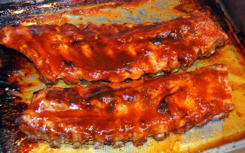 In dit recept worden de spareribs bereidt in de oven. Wil je de spareribs graag op de barbecue roosteren, bereidt ze dan eerst in de oven en leg ze daarna nog even op de barbecue. Je kunt de spareribs ook een dag van tevoren al bereiden in de oven, laten afkoelen en de volgende dag op de barbecue gooien.