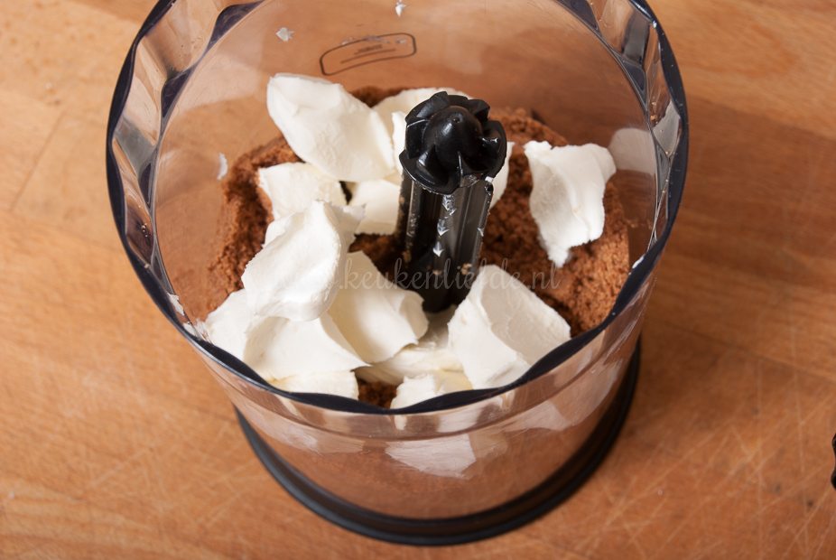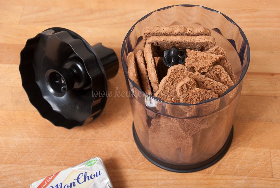 Maal de koekjes in een keukenmachine tot fijne kruimels. Schep één eetlepel koekkruim uit de kom en houd achter voor garnering. Voeg de MonChou toe aan de overige kruimels en mix verder totdat er een stevige massa ontstaat. Vorm met je handen circa 25 balletjes van het deeg. Rollen lukt niet echt, dan vallen ze uit elkaar, dus knijp ze in je hand tot een bal.