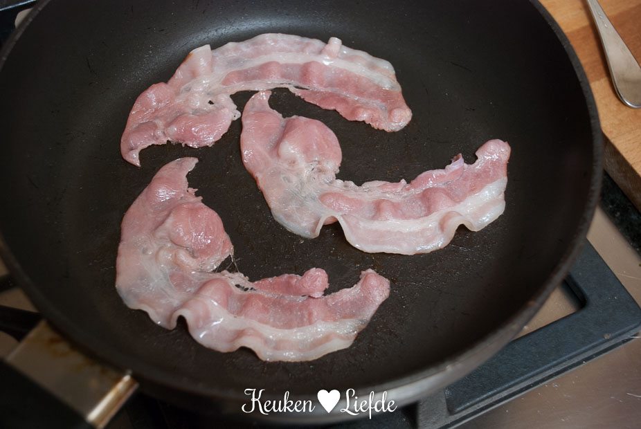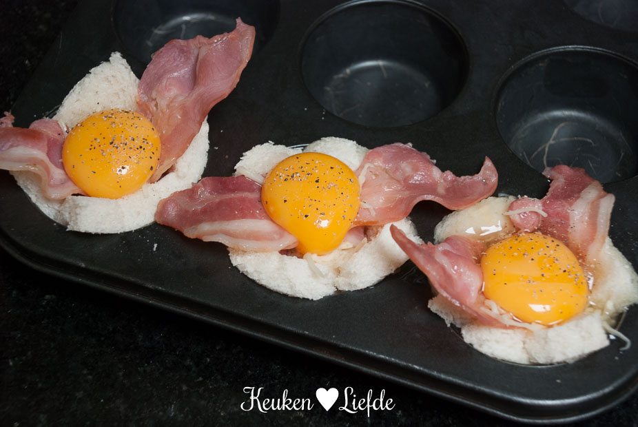 Bak het ontbijtspek in een koekenpan op laag vuur, totdat het iets geslonken, maar nog licht van kleur is. Bekleed de muffinvormpjes met het brood en beleg elk vormpje met een plakje spek en wat kaas. Breek voorzichtig een ei boven elk broodbakje. Probeer het brood niet te scheuren, want als het ei het bakblik raakt, is het broodbakje straks moeilijk los te halen uit de vorm.