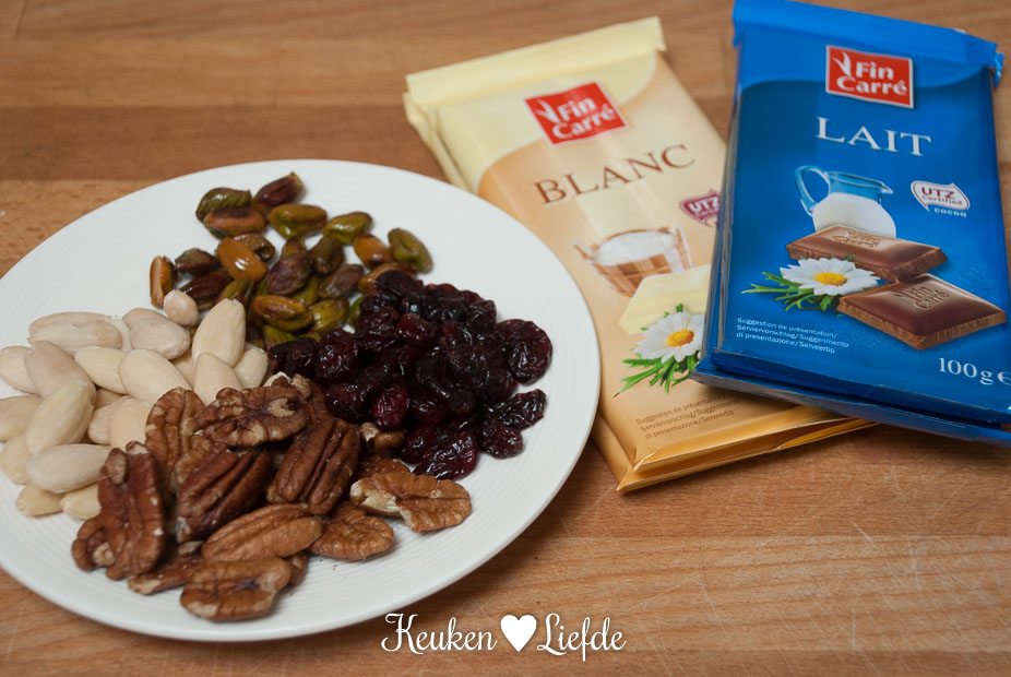 Ik zou het ook niet weten. Met wat chocola en nootjes maak je in een handomdraai deze genotvolle chocoladeflikken. Ik koos voor pecan, cranberry, pistache en amandel omdat dochterlief daar zo dolverliefd op is. Maar varieer gerust naar hartenlust met de ingrediënten; daag je kinderen uit om er hun eigen speelse draai aan te geven: gekleurde muisjes, vrolijke sprinkles, M&M’s, nogatine, geraspte kokos – de versiermogelijkheden zijn oneindig. Of maak oer-Hollandse musket- of studentenflikken! Allemaal even lekker.