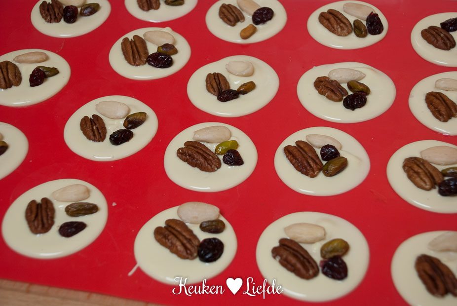 Breek de chocolade in kleine stukjes en smelt au bain-marie (in een kom, boven een pan met warm water). Roer de gesmolten chocolade glad en schep met een eetlepel bergjes chocolade op het bakmatje. Strijk met de achterkant van de lepel uit tot een rondje. (Je kunt de gesmolten chocolade ook in een spuitzak doen en bergjes chocolade op het bakblik spuiten.) Leg op elk chocoladerondje een pecan, cranberry, pistache en amandel en laat de chocolade volledig hard worden.