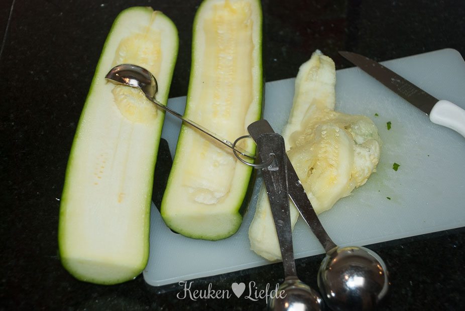 Snijd de courgettes over de lengte doormidden en hol ze voorzichtig uit met een theelepel. Hak het uitgeholde vruchtvlees fijn.