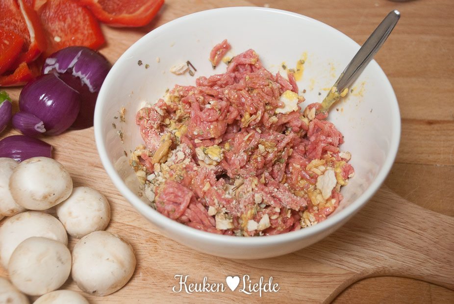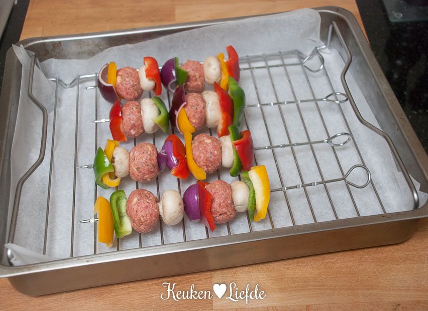 Draai er acht middelgrote gehaktballetjes van. Rijg om en om stukjes paprika, champignons, rode ui en gehaktballetjes aan de spiezen. Verdeel alle ingrediënten over 4 spiezen.