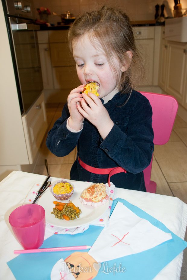 Dit is een ontzettend makkelijk en leuk kinderrecept dat tevens ideaal is om etensrestjes uit de koelkast mee op te maken. Restjes tomatensaus, een verdwaald stukje paprika of prei, een geopend blikje mais: je mag het allemaal gebruiken voor deze feestelijke macaroni-frittata’s. Ze worden er alleen maar kleurrijker en smakelijker van! Omdat ik geen restjes groenten meer in de koelkast had liggen, trok ik een blikje wortels en doperwten open om ernaast te serveren, maar je kunt ze natuurlijk ook gewoon in de frittata stoppen. Overgebleven frittata’s kun je de volgende dag koud in de broodtrommel stoppen of even opnieuw in de oven opwarmen. In de zomer gaan ze mee in de picknickmand. Heerlijk!