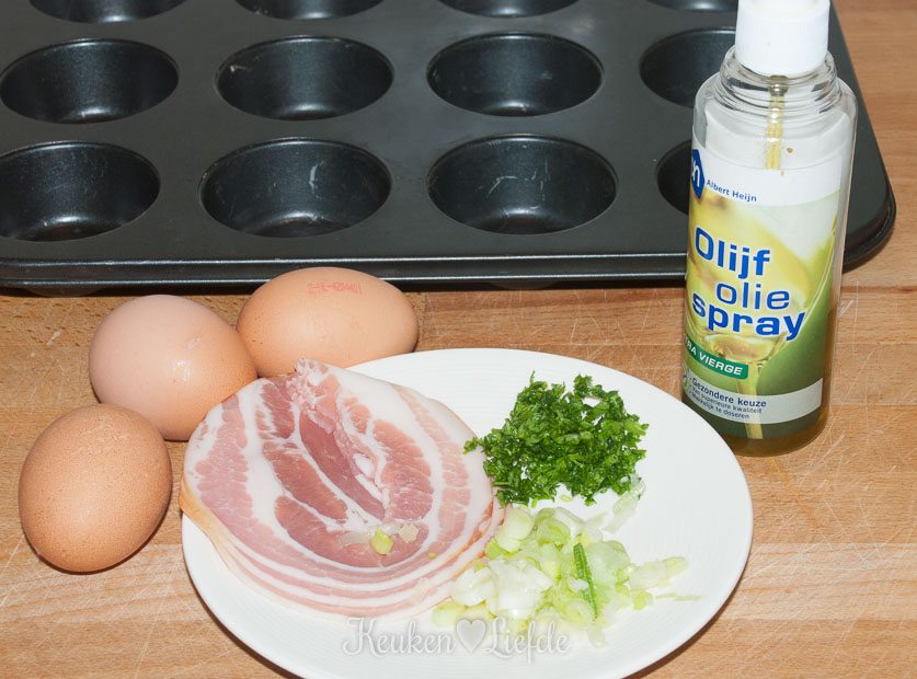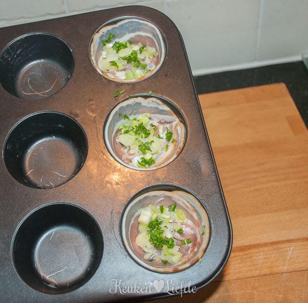 Verwarm de oven voor op 200 graden en vet 3 vormpjes goed in met wat olie. Trek het ontbijtspek voorzichtig uit elkaar, zodat je een lange plak krijgt en bekleed hier het vormpje mee. Zorg dat de vorm helemaal bedekt is met het spek. Verdeel de lente-ui en de helft van de peterselie over de het spek en breek in elk vormpje een ei. Bestrooi het ei met zout en peper en de rest van de peterselie en bak de spek-eimuffins circa 15 minuten in de oven, of totdat het ei gestold is.