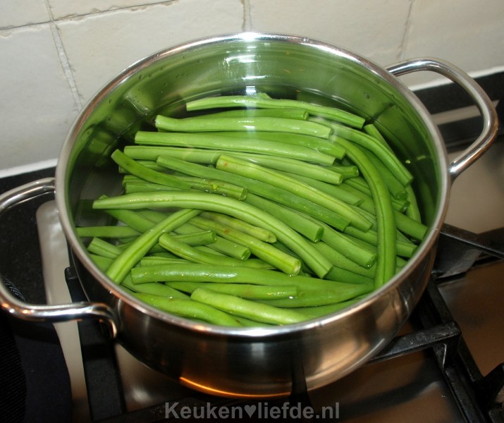 Halveer de sperziebonen. Breng een ruime pan met licht gezouten water aan de kook en voeg de sperziebonen toe. Kook ze beetgaar.