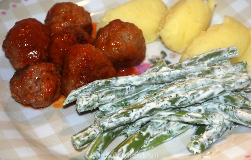 Warm op laag vuur even zachtjes door. Proef en breng eventueel op smaak met zout en peper. Wij serveerden de boontjes met mini-gehaktballetjes in à la minute tomatensaus en aardappelquenelles.