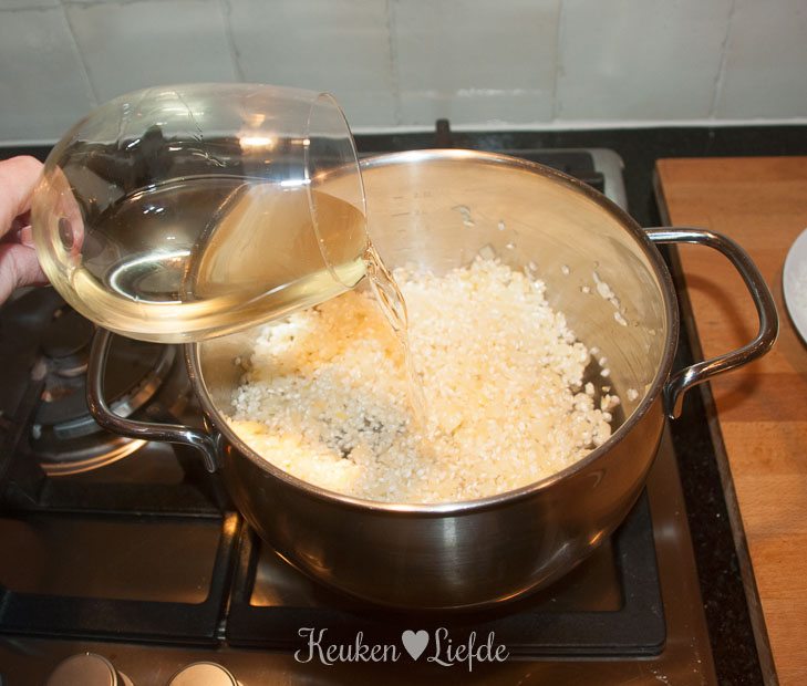 Verhit de kookpan met wat olie en fruit op laag vuur de ui en knoflook, totdat ze zacht maar niet gekleurd zijn. Voeg de risottorijst toe en roer even door. Blus af met de wijn en laat even inkoken.