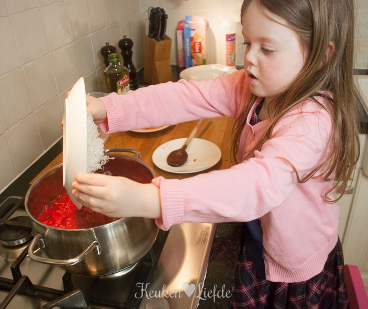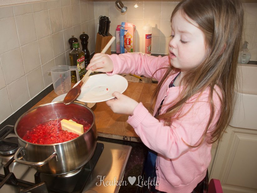 Verkruimel de bouillontabletten over de risotto en voeg zoveel water toe totdat de risotto net onder staat. Roer even door, voeg de bietjes toe (mijn bietjes waren nog vrij hard, dus voegde ik ze al direct toe om verder te laten garen) en laat op laag vuur zachtjes pruttelen. Voeg steeds opnieuw wat water toe als het vorige bijna is opgenomen (de risotto mag niet te droog worden!).