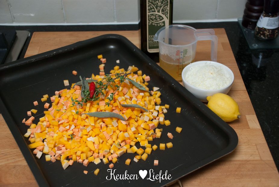 Snijd de pompoen in middelgrote stukken (de schil mag blijven zitten) en leg ze op een bakblik. Hussel om met een flinke scheut olijfolie, de takjes tijm, salie en chilipeper. Breng goed op smaak met zout en peper. Rooster de pompoen circa 20 tot 30 minuten in de oven, of totdat hij zacht is. Haal uit de oven en laat iets afkoelen. Verwijder de takjes tijm en salie en doe de pompoen — samen met de citroenrasp, bouillon en pecorino — in de keukenmachine. Pureer tot een gladde puree. Laat afkoelen en bewaar tot gebruik in de koelkast.