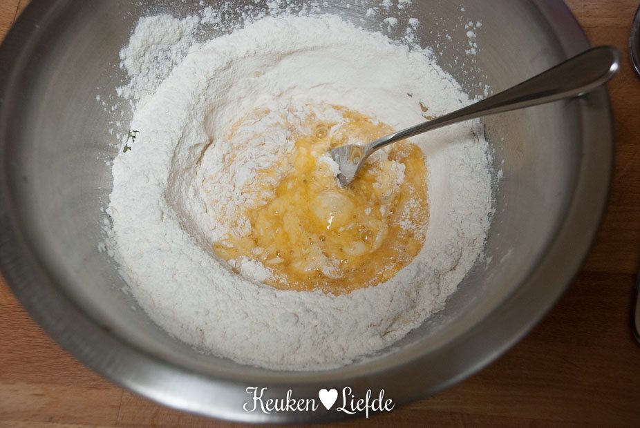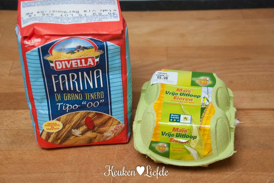 Doe de bloem in een kom en meng met een snuf zout. Maak een kuiltje in het midden en breek hier de eieren in. Voeg een klein scheutje olijfolie toe en kneed het deeg net zolang, totdat je een gladde en soepele deegbal hebt. Wikkel goed in vershoudfolie en leg minimaal een uur (mag ook een hele nacht) in de koelkast.