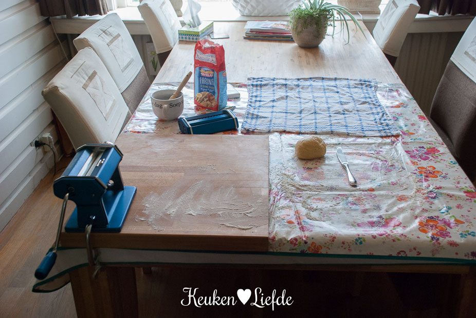 Zorg voor voldoende werkruimte. Maak een grote tafel vrij die je kunt bestrooien met bloem. (Ik bekleed de tafel eerst met een plastic tafelkleed.) Klem de pastamachine vast op de tafel.