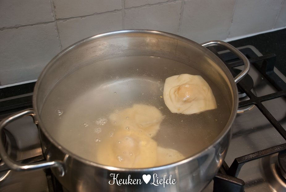 Kook de ravioli — eventueel in meerdere porties, als je niet zo’n grote pan hebt — in een grote pan met licht gezouten, kokend water. De ravioli is goed als ze boven komen drijven.