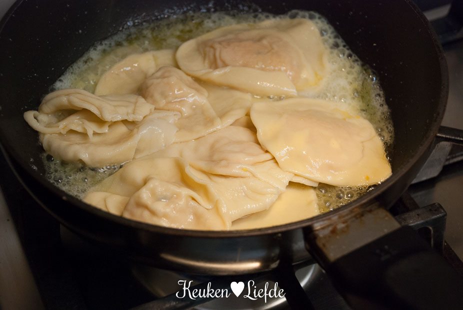 Smelt — ondertussen als de ravioli kookt —op laag/middelhoog vuur de boter, samen met de salie in een grote koekenpan. Schep de gare ravioli zo vanuit het kookwater in de koekenpan met boter en hussel even om, totdat je ziet dat het aanhangende kookvocht en de boter samensmelten tot een mooie saus.