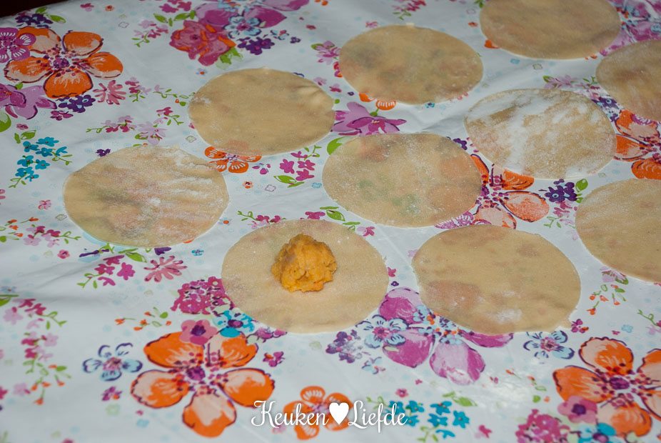 In plaats van ringen uit het deeg te steken, kun je ook hoopjes pompoenvulling verdelen over een deeglap, bestrijken met water en de andere deeglap erbovenop leggen. Vervolgens snijd je de ravioli uit het deeg. Op youtube vond ik een filmpje waarin Gennaro laat zien hoe je dit eenvoudig doet.