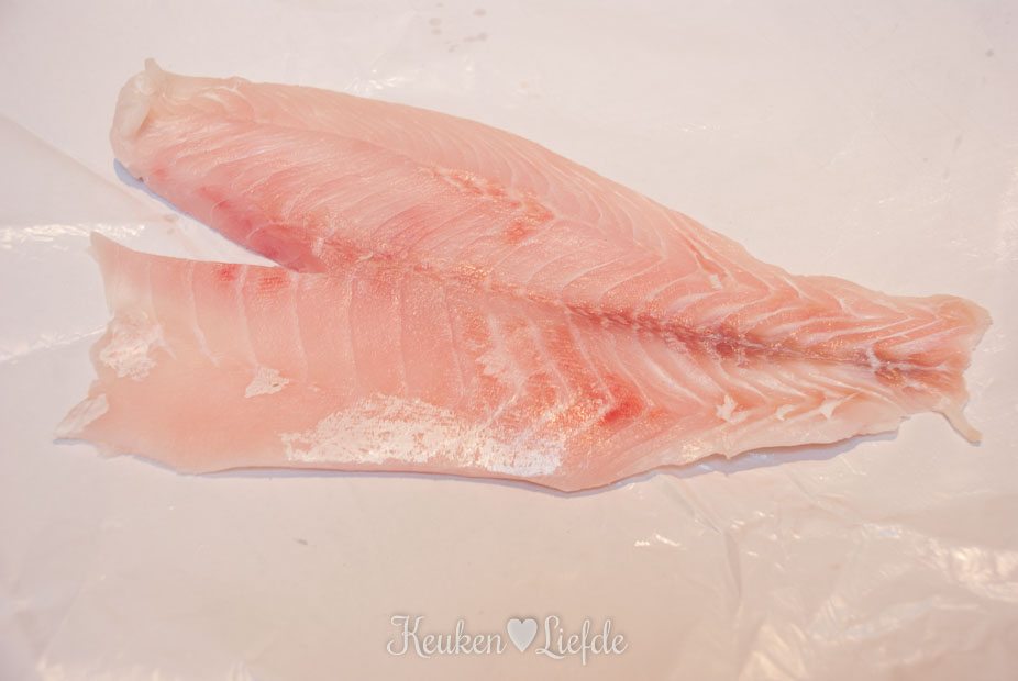 - Circa 300 g stevige witvisfilet aan één stuk (Ik gebruikte victoriabaars – graten door de visboer verwijderd –, maar je kunt ook dikke moten losse visfilet gebruiken. Reken 100 – 150 g vis per persoon)