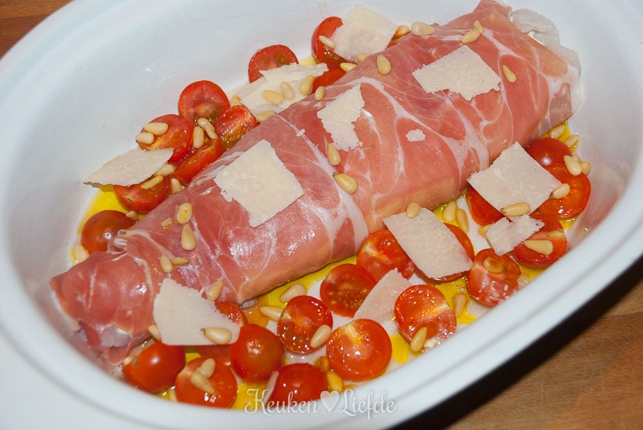 Leg de vis in een licht ingevette ovenschaal en verdeel de cherrytomaten, pijnboompitten en Parmezaanflinters eroverheen. Besprenkel met wat olijfolie (en eventueel een klein scheutje witte wijn) en zout en peper.