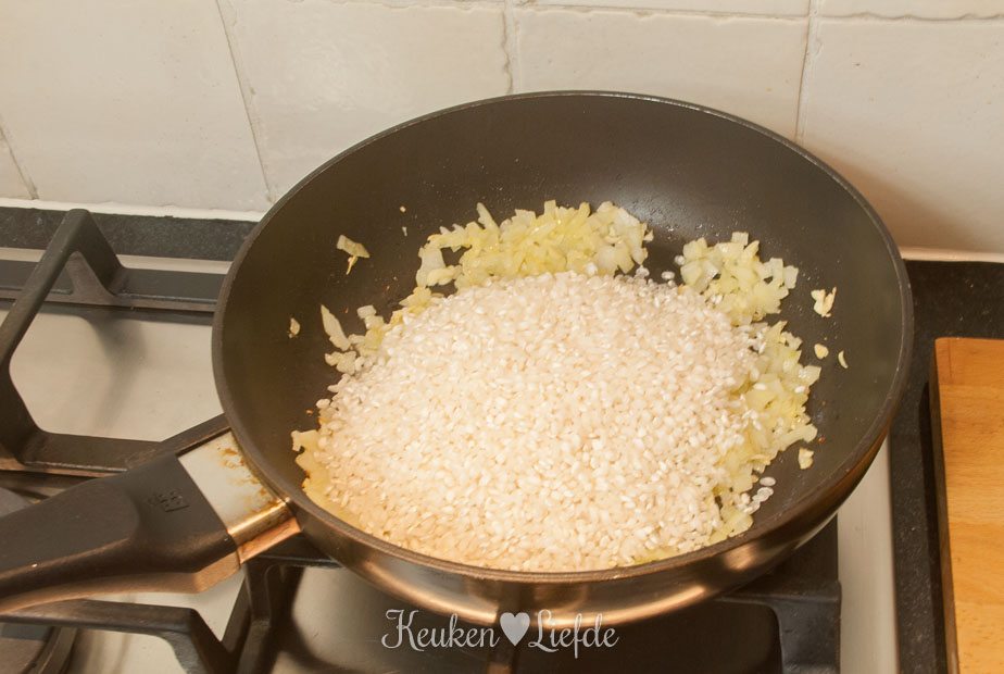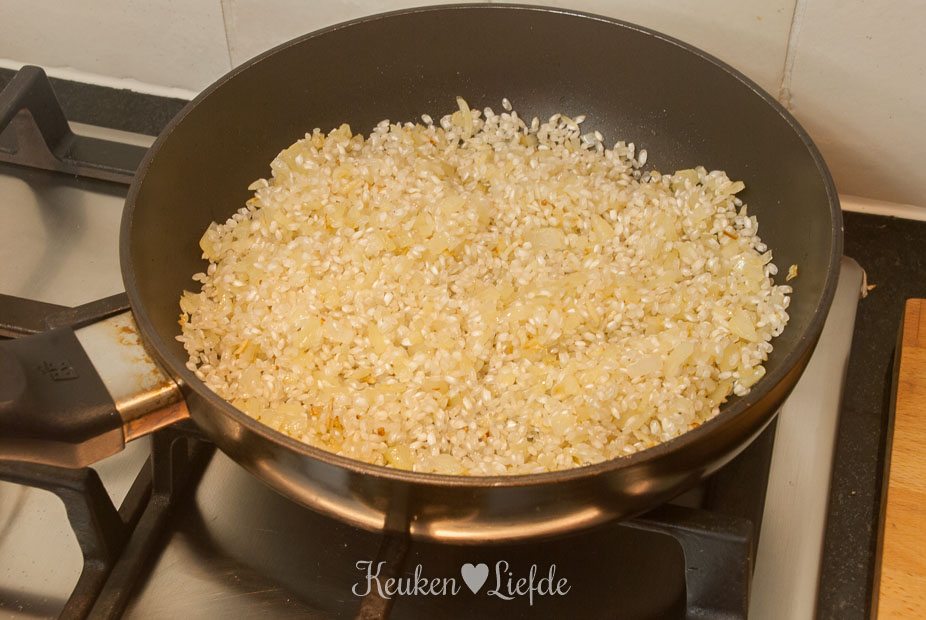 Verhit een ruime hapjes- of braadpan met wat olie en fruit op laag vuur de ui en knoflook aan, totdat ze zacht zijn. Voeg de rijst toe en bak kort even mee.