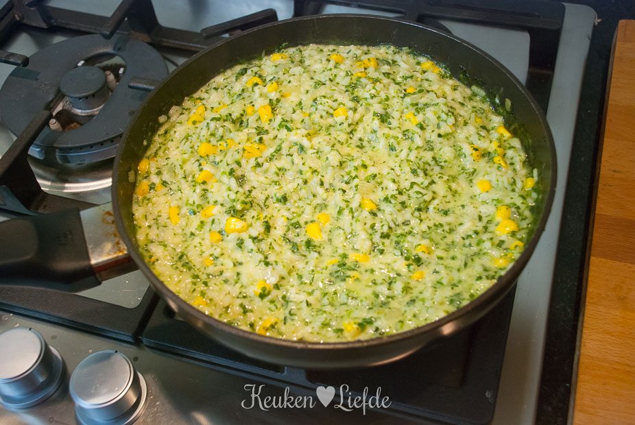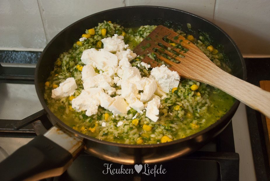 Kook de risotto op laag tot middelhoog vuur zachtjes gaar. Roer regelmatig en voeg steeds opnieuw wat water toe als het vorige is opgenomen. Als de risotto beetgaar is roer je de mais en geitenkaas erdoor en warm even mee.