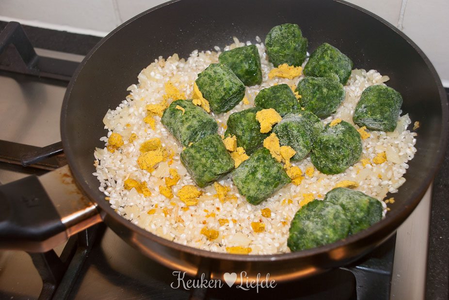Verkruimel de bouillontabletten over de rijst, voeg de spinazie toe en voeg zoveel water toe, totdat de rijst net onder staat.