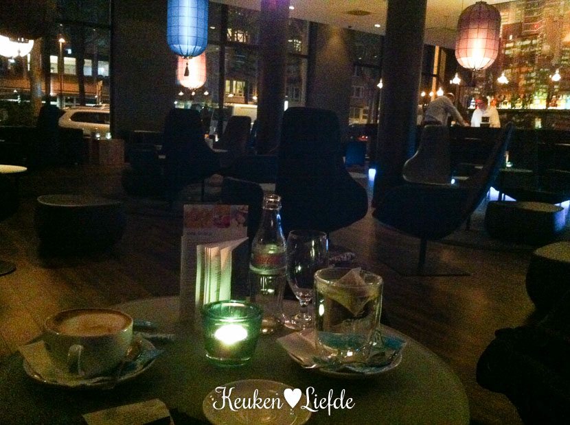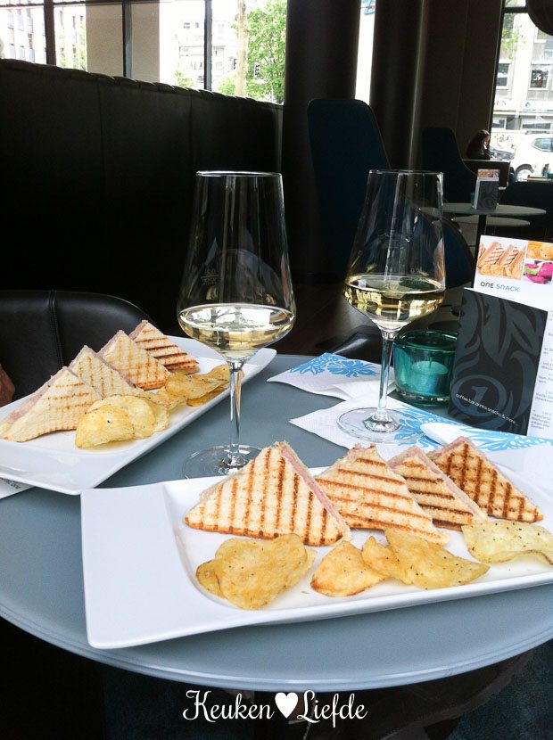 We krijgen trek. In de lobby bestellen we een drankje en knabbelen we van gekruide chips en heerlijke tosti’s.