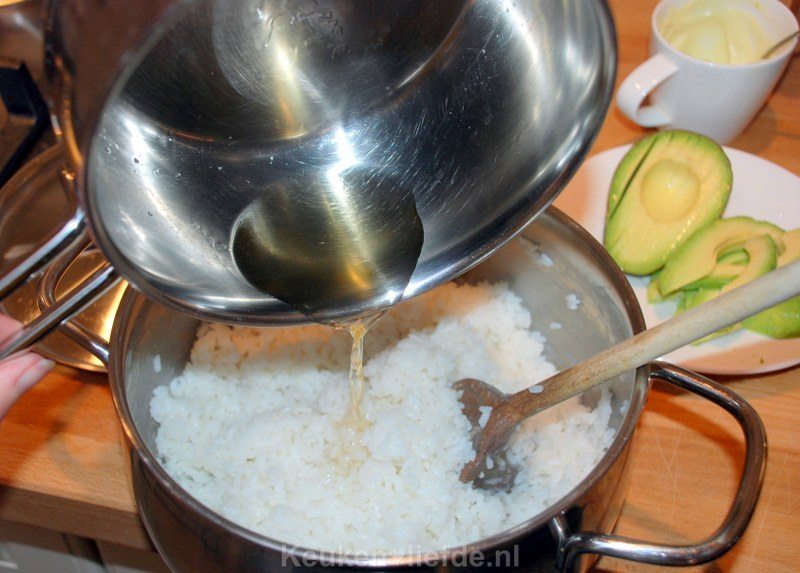 Verwarm ondertussen in een klein pannetje de azijn, suiker en het zout totdat de suiker en het zout zijn opgelost (niet laten koken!). Voeg de marinade toe aan de rijst en roer voorzichtig door. Door de marinade krijgt de rijst een heerlijke smaak en mooie glans.