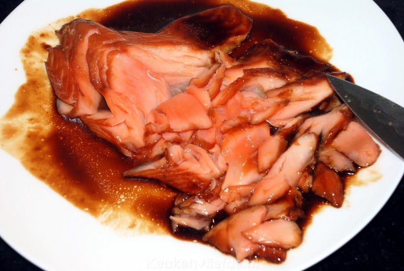 Dep de zalm met keukenpapier droog en doe hem in de diepvrieszak. Giet er wat teriyakisaus bij zodat de zalm bedekt is met een laagje saus en sluit de zak.