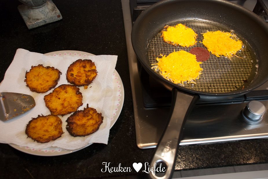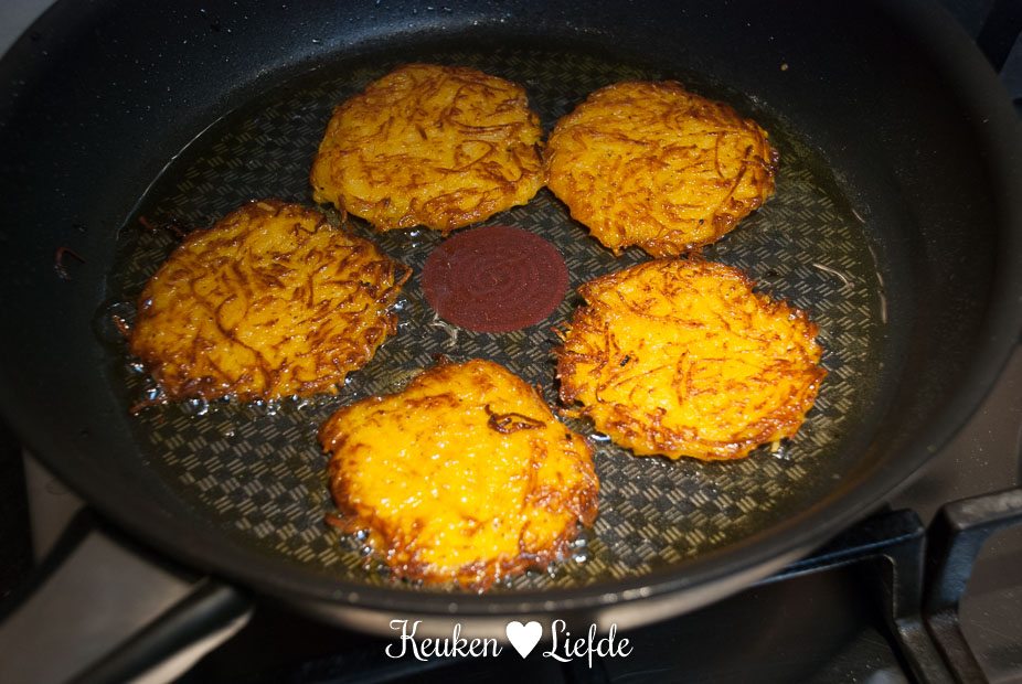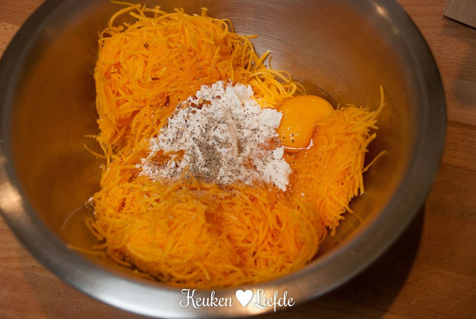 Schil de flespompoen en snijd hem in kleinere stukken (zodat ze door de opening van de keukenmachine passen). Voor dit gerecht heb je ongeveer de helft van de pompoen (400 gram) nodig. De andere helft kun je gebruiken voor een ander recept. (Bijvoorbeeld deze pompoenrisotto) Verwijder de pompoenpitten in het dikke gedeelte van de pompoen. Rasp de pompoen met een fijne rasp en meng in een kom met het ei, de bloem en de chilivlokken. Breng goed op smaak met peper en zout. Verhit een grote koekenpan met wat bakboter of olie en bak circa 16 kleine rondjes van het pompoenmengsel. Maak de rondjes niet te dik, zodat ze snel gaar zijn en mooi krokant bakken. Houd de pompoen-rostirondjes warm in de oven.