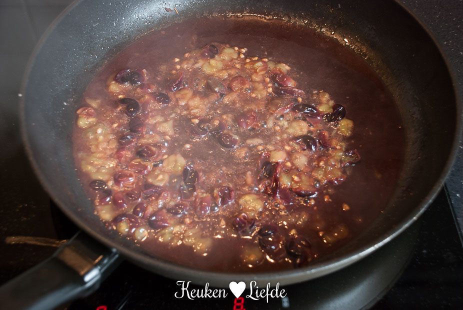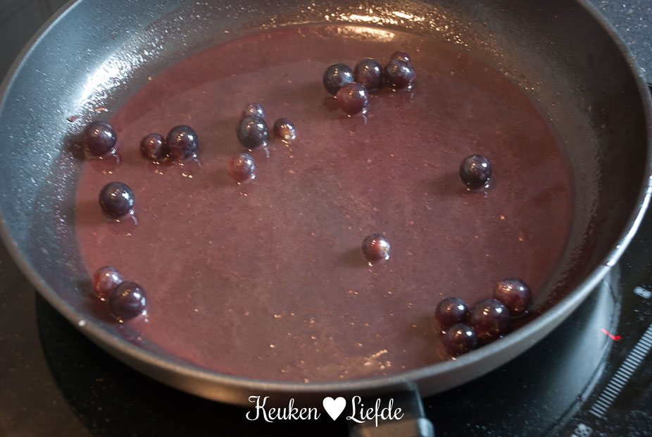 Schenk de helft de het bakvet uit de koekenpan (je hebt dit verder niet meer nodig, maar je kunt het bewaren om bijvoorbeeld aardappels in te bakken) en voeg de port en de helft van de druiven toe. Laat op middelhoog vuur even koken, totdat de druiven openbarsten. Voeg indien nodig een scheut water toe als je te weinig vocht hebt. Plet de druiven met een vork en haal de saus door een fijne zeef. Doe weer terug in de pan en voeg de overige druiven toe, warm nog kort even door.