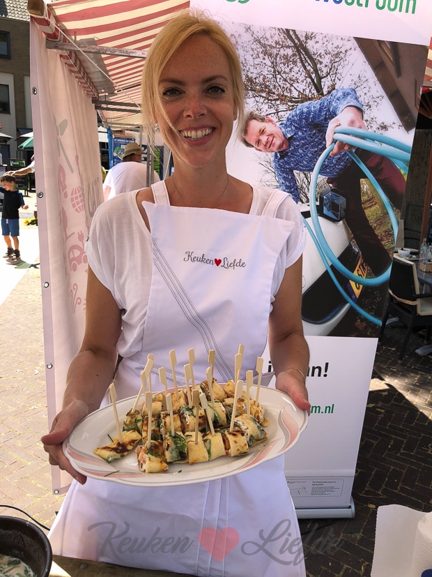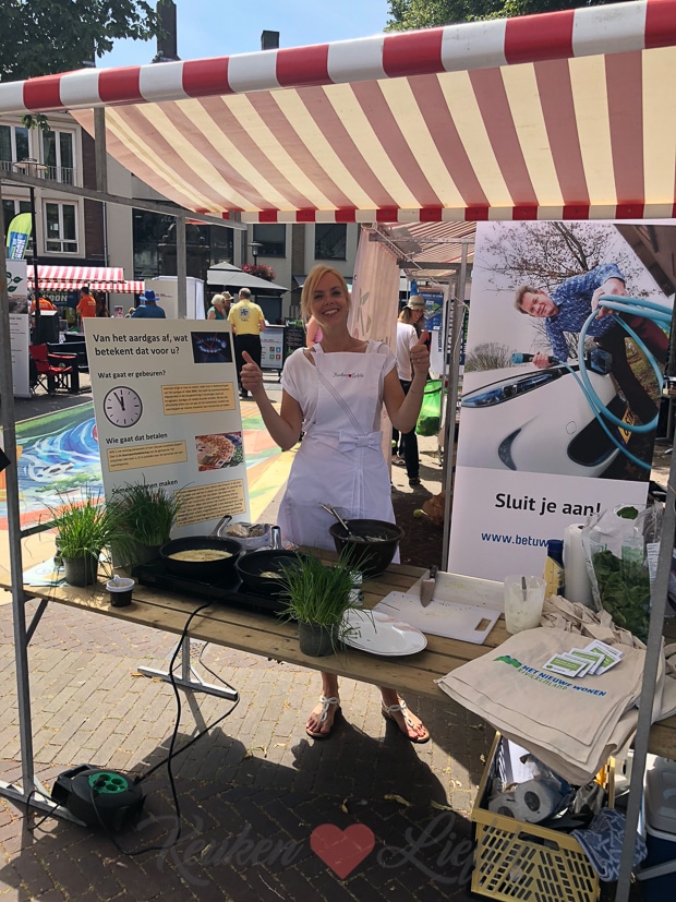 We konden niet zolang blijven want ‘s middags gaf ik een kookdemo op de Woonmarkt in Tiel. Het thema was duurzaam wonen met als speerpunt aardgasvrij wonen. Ik kookte dus niet op gas maar op inductie. Ik kook zelf thuis nog op gas maar in ons nieuwe huis wil ik zo snel mogelijk de overstap maken naar inductie. Koken op inductie heeft veel voordelen: het is energiezuinig, snel, veilig, nauwkeurig en makkelijk schoon te maken. Ik maakte trouwens opgerolde spinaziepannenkoeken met zelfgemaakte bieslookroomkaas en zalm. Ella-Marie deelde ze uit en en kon het niet laten er zo nu en dan een in haar eigen mond te stoppen. Haha!