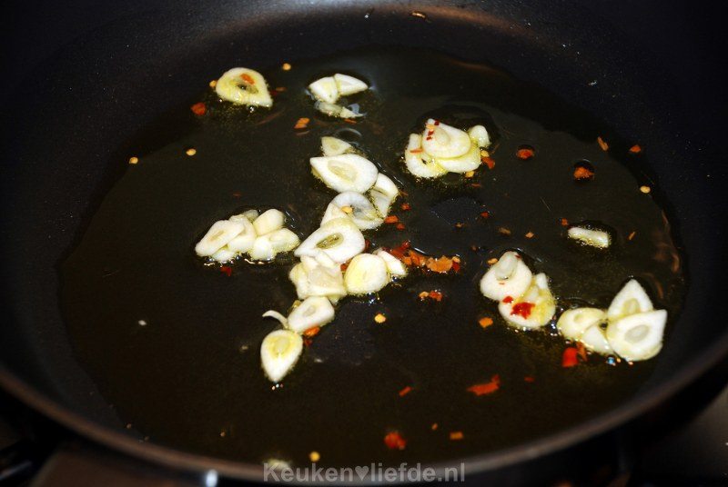 Verwarm de oven voor op 200 graden. Verhit een koekenpan of wok met wat olie en fruit de knoflook en chilivlokken zacht.