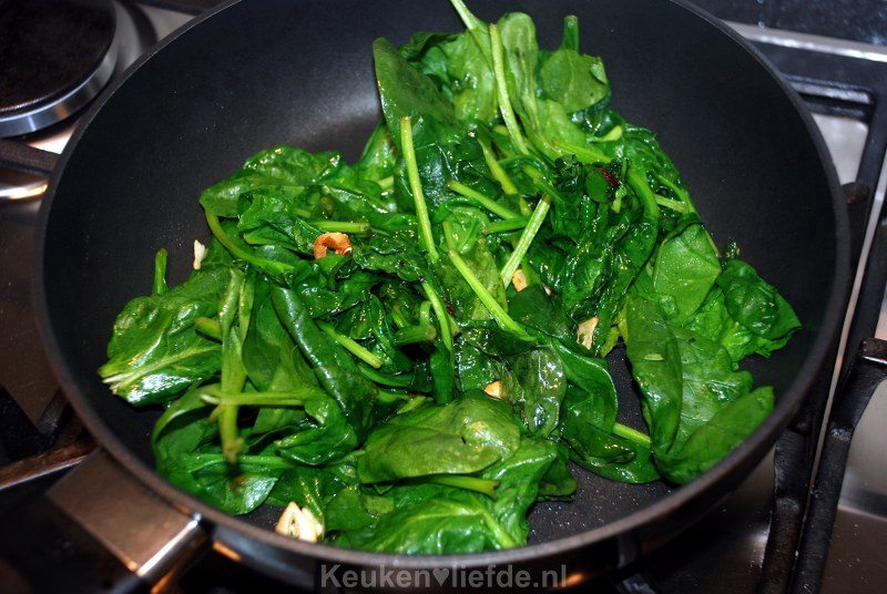 Voeg de spinazie toe en roerbak op hoog vuur, totdat de spinazie geslonken en het meeste vocht verdampt is.