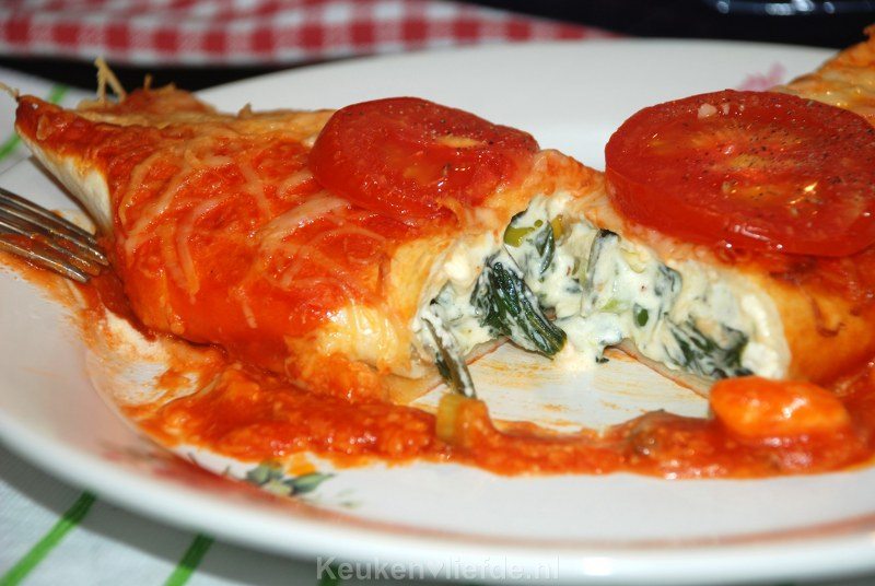 Verdeel de helft van de tomatenfritto en geraspte kaas over de bodem van de ovenschaal. Verdeel de spinazie-feta vulling over de twee tortilla’s en rol ze op.
