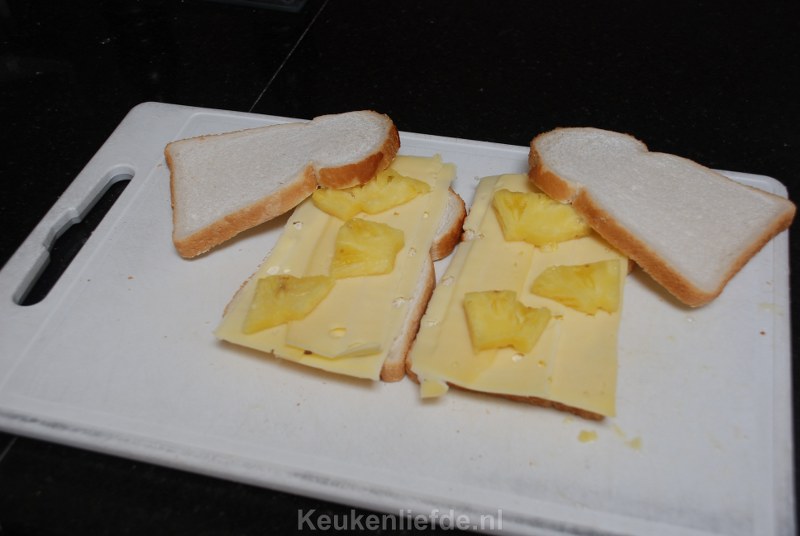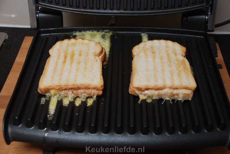 Leg de andere twee boterhammen er bovenop en bereid ze verder naar eigen wens. Wanneer je de oven of koekenpan kiest smeer dan de buitenkant van het brood eerst in met een beetje boter. Als je een ijzer of grillapparaat gebruikt dan is dit niet nodig. Bak ze totdat ze goudbruin zijn en de kaas gesmolten is.