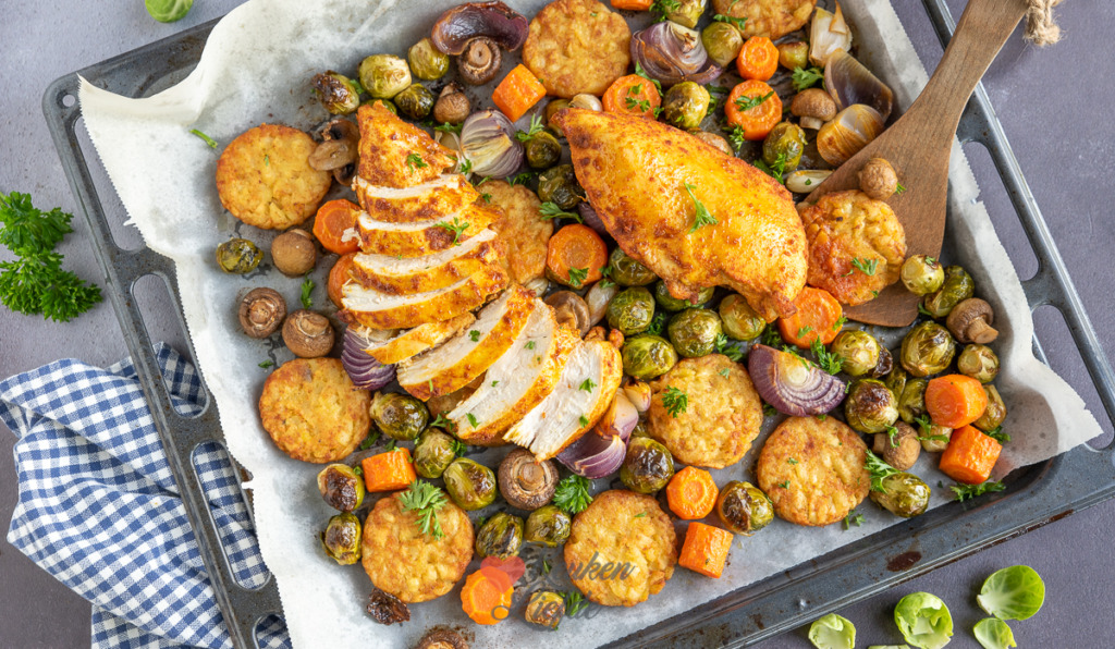 Niks makkelijker dan een traybake voor het avondeten. Alles van één bakblik en de oven doet al het werk. Varieer met ingrediënten uit het seizoen, zo zet je steeds weer iets verrassends op tafel. Deze traybake met röstirondjes, spruitjes en kip smaakt heerlijk in de herfst-, en wintermaanden. De kipfilet leg je de laatste tien minuten van de oventijd op de groenten en röstirondjes en blijft zo lekker mals en sappig.