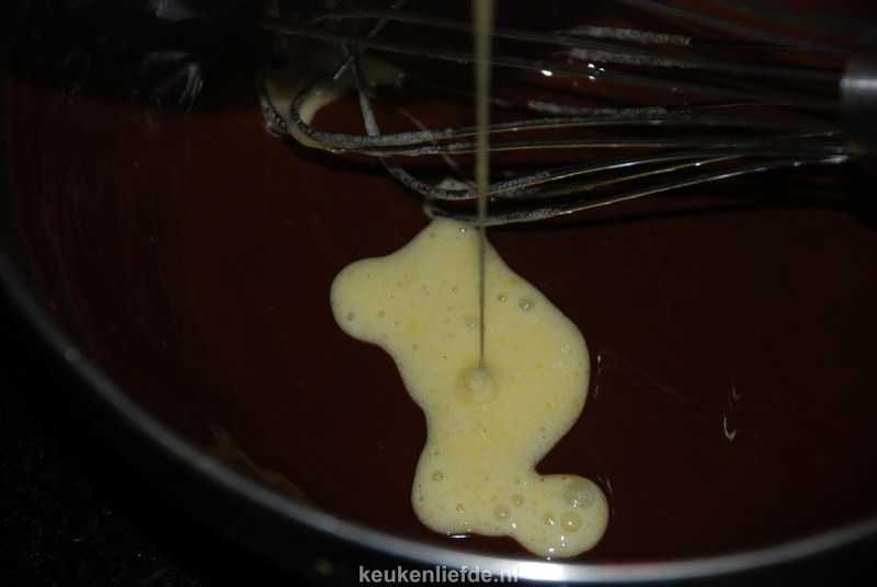 Klop 75 gram suiker en 1 ei los in een kom en voeg het dan toe aan het chocolademengsel.