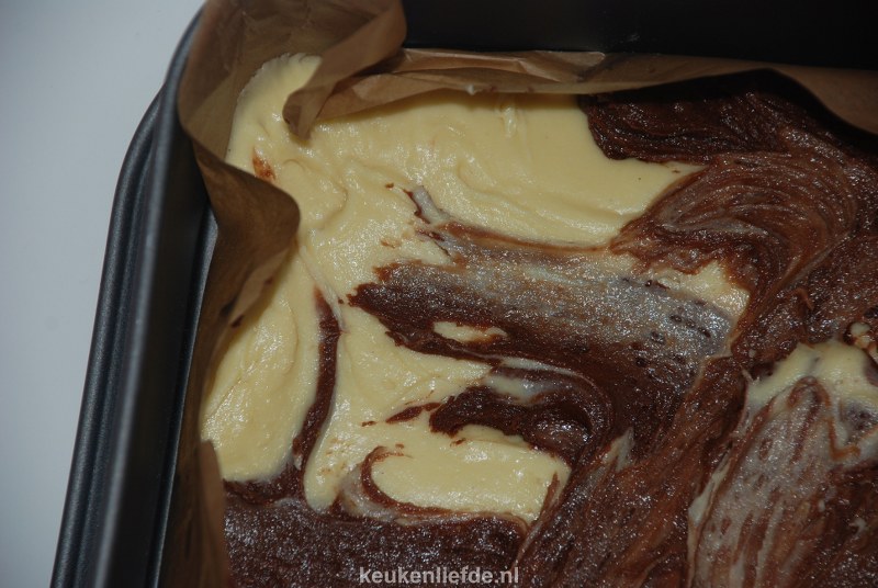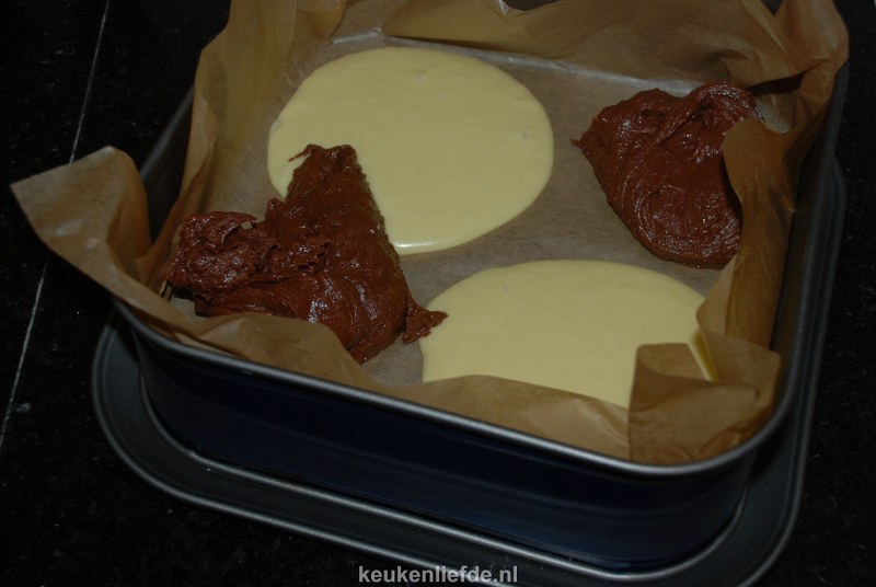 Schep de 2 kleuren beslag om en om in het bakblik en bak 25 tot 30 minuten in de oven.