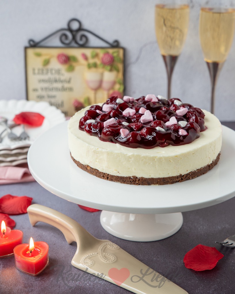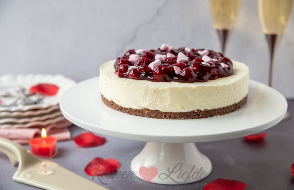 Verwijder voor serveren de springvorm. Snijd eerst met een mes de rand los voordat je de springvorm opent. Garneer vlak voor serveren met de eetbare Valentijns-lekkernijen.