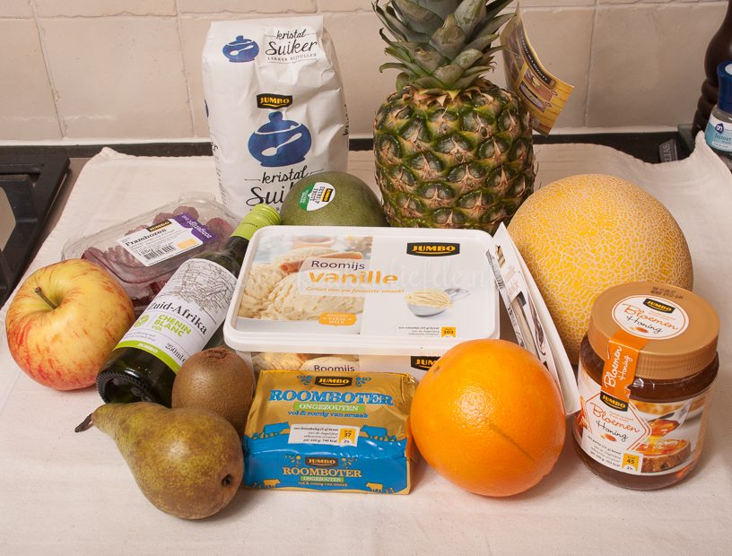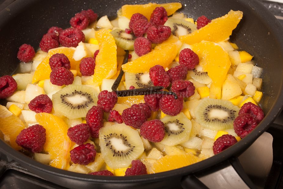 Maak het fruit schoon. Schil de appel, peer, mango, ananas en meloen in kleine blokjes, de sinaasappel in partjes en de kiwi in plakjes. Smelt de boter in de koekenpan. Voeg de suiker toe. Voeg de appel, peer en honing toe en bak 3 minuten. Voeg de ananas toe en bak 1 minuut verder. Schraap intussen met een scherp mes het merg uit het vanillestokje. Voeg het vanillemerg met het opengesneden vanillestokje toe. Voeg vervolgens de kiwi, mango en meloen en bak nog 1 minuut verder. Besprenkel het fruit met de wijn. Neem de pan eventueel van het vuur en bewaar het fruit tot serveren.