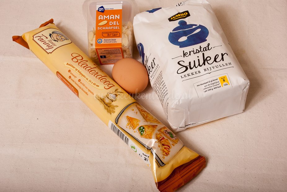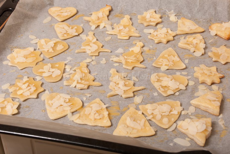 Verwarm de oven voor op 200 graden. Bestrooi de helft van het bladerdeeg met 1 el suiker en vouw het bladerdeeg dubbel. Bestrooi de bovenkant van het deeg met de overige suiker en rol het deeg uit tot een langwerpige plak. Steek met de kerstvormpjes koekjes uit het deeg en prik gaatjes in de koekjes met een vork. Leg de koekjes op een met bakpapier bekleed bakblik en dek af met een tweede vel bakpapier en een bakblik (ik heb maar één bakblik dus gebruikte hier ovenschaaltjes voor). Bak 10 minuten in de oven en verwijder dan het bakblik en bovenste vel bakpapier. Bestrijk de koekjes met losgeklopt ei en bestrooi met de amandelen. Bak nog 5 tot 10 minuten verder, of totdat de koekjes goudbruin zijn. Wil je de koekjes bewaren om later te gebruiken, bak ze dan wat korter in de oven, laat ze volledig afkoelen en bewaar daarna in een luchtdichte zak.