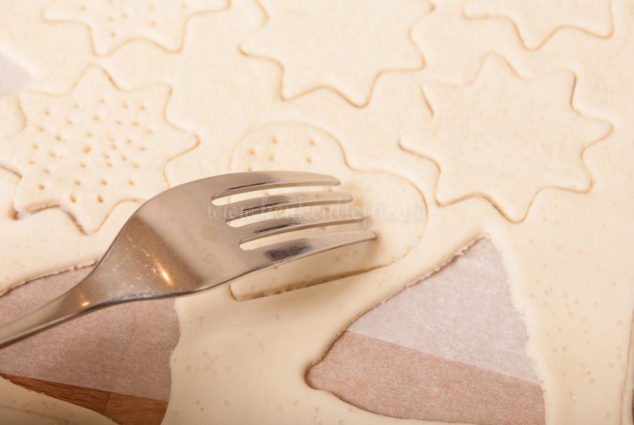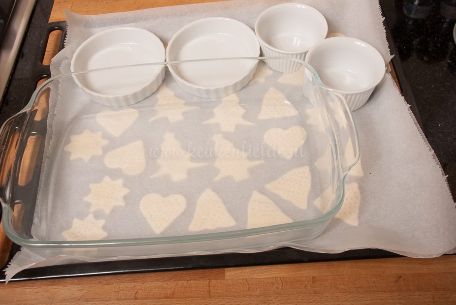 2 vellen bakpapier, deegroller, kwastje, kerstkoekvormpjes om uit te steken, koekenpan, 4 diepe borden