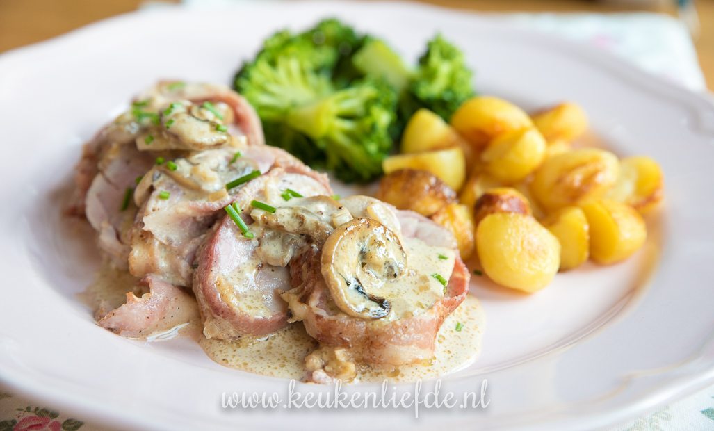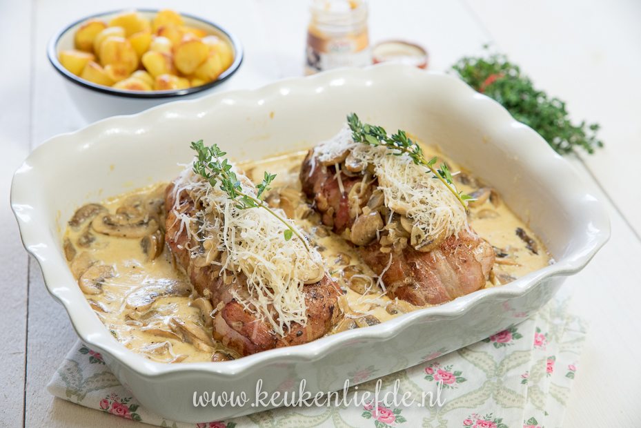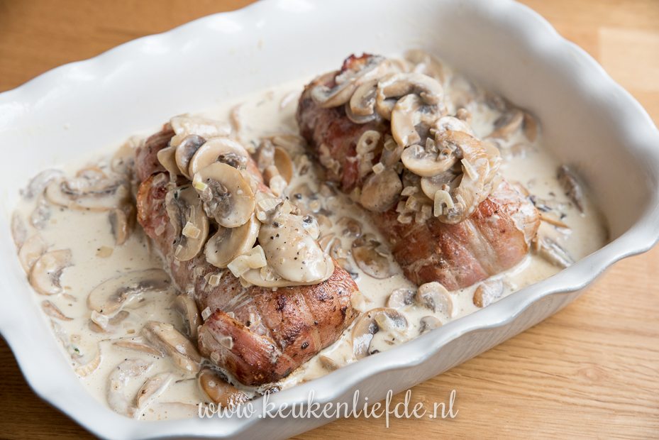 Varkenshaas uit de oven met truffelpesto, spek en champignonsaus