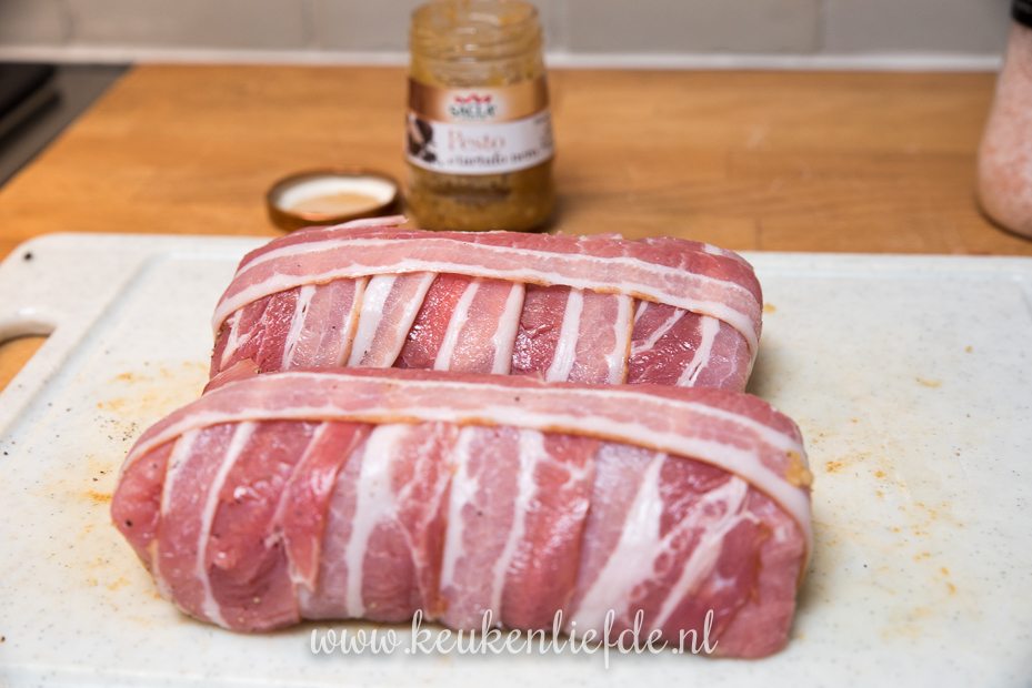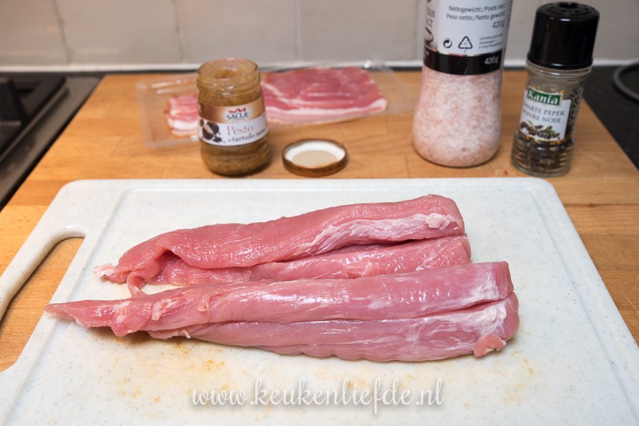 Snijd de varkenshaasjes over de lengte open, maar niet helemaal doormidden. Vul de varkenshaasjes royaal met truffelpesto en klap weer dicht. Bestrooi de varkenshaasjes rondom met zout en peper, niet teveel. Klap het dunne gedeelte van de varkenshaas om, zodat de varkenshaas overal even dik is. Omwikkel met ontbijtspek.