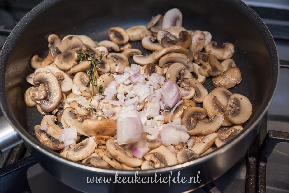 Verwijder met een stukje keukenrol eventueel zwarte stukjes uit het braadvet in de koekenpan. Voeg indien nodig nog wat extra vloeibare boter toe aan het bakvet en voeg de champignons toe. Bak op hoog vuur, totdat het meeste vocht uit de champignons verdampt is en ze beginnen te kleuren. Voeg de sjalot en knoflook toe en bak kort mee totdat de sjalot zacht, maar niet gekleurd is.