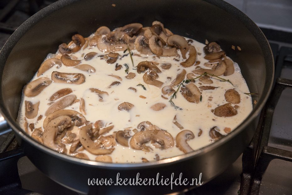 Voeg de room toe en breng aan de kook. Proef de saus en breng indien nodig extra op smaak met zout en peper. Laat de saus op middelhoog vuur zachtjes een minuut pruttelen. Verwijder de takjes tijm en schenk de champignonsaus over de varkenshaas. Bestrooi met Parmezaan.